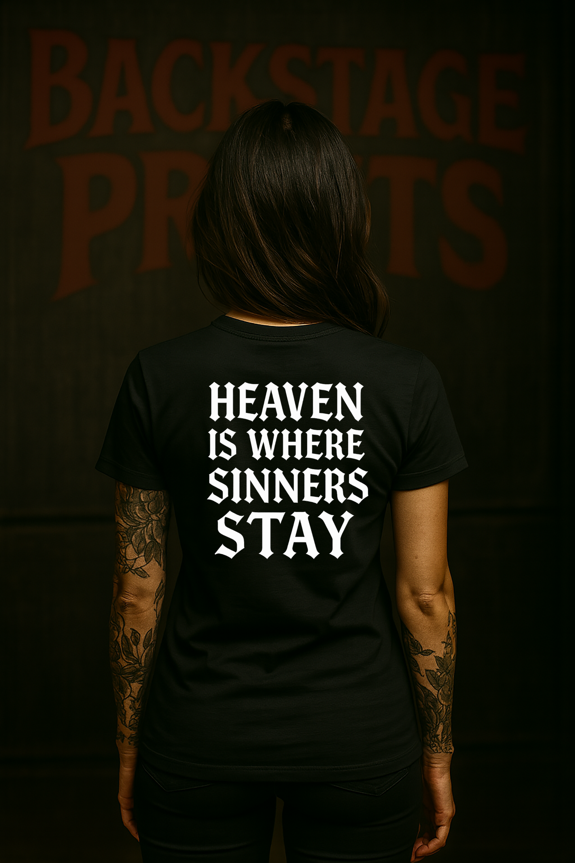 Black Angel Gothic T-Shirt – Heaven Is Where Sinners Stay Back Print –Short Sleeve Tee