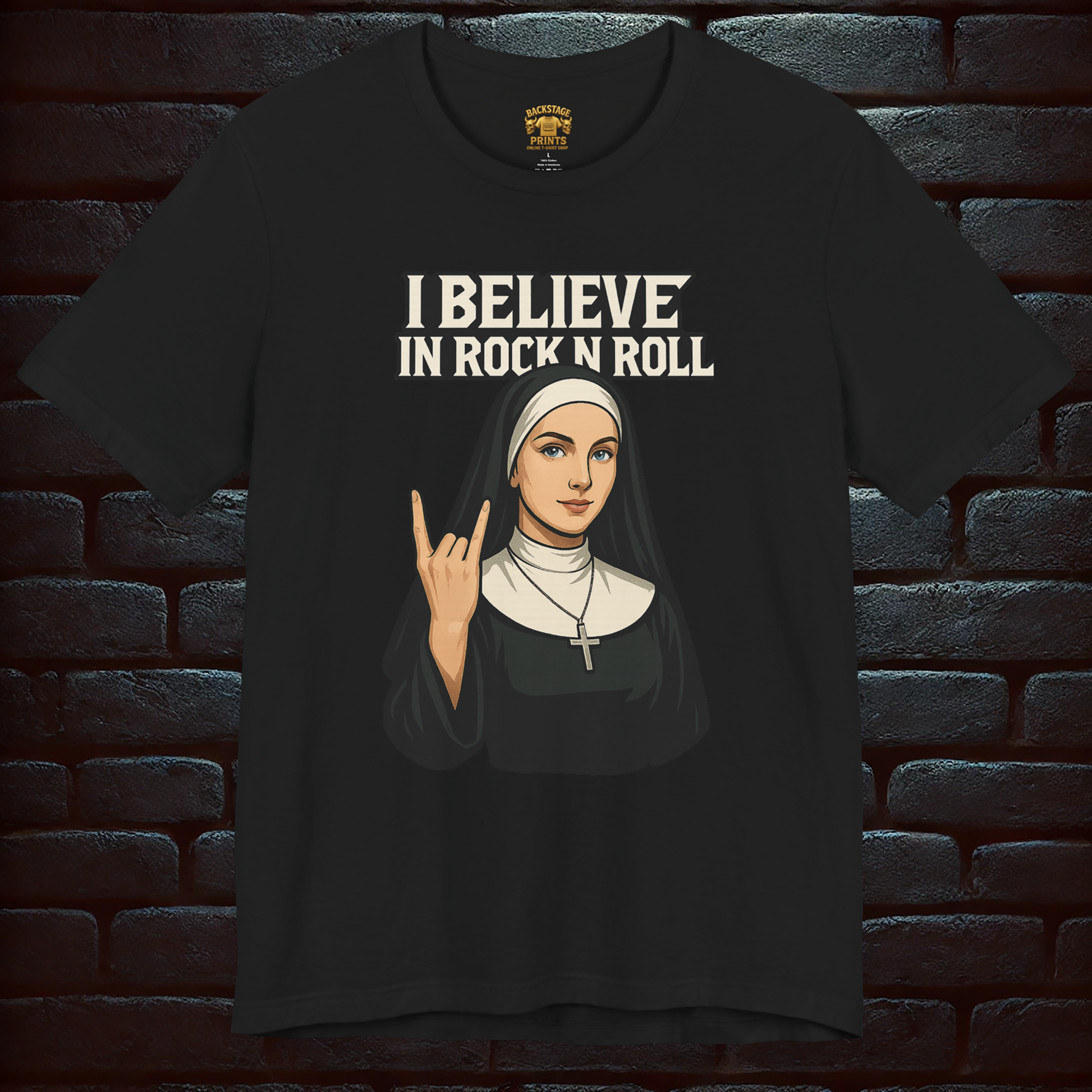 On the front, a confident nun throws the iconic rock hand sign with the text “I Believe in Rock N Roll”, while the back carries the powerful message “Let’s Rock the Church”.