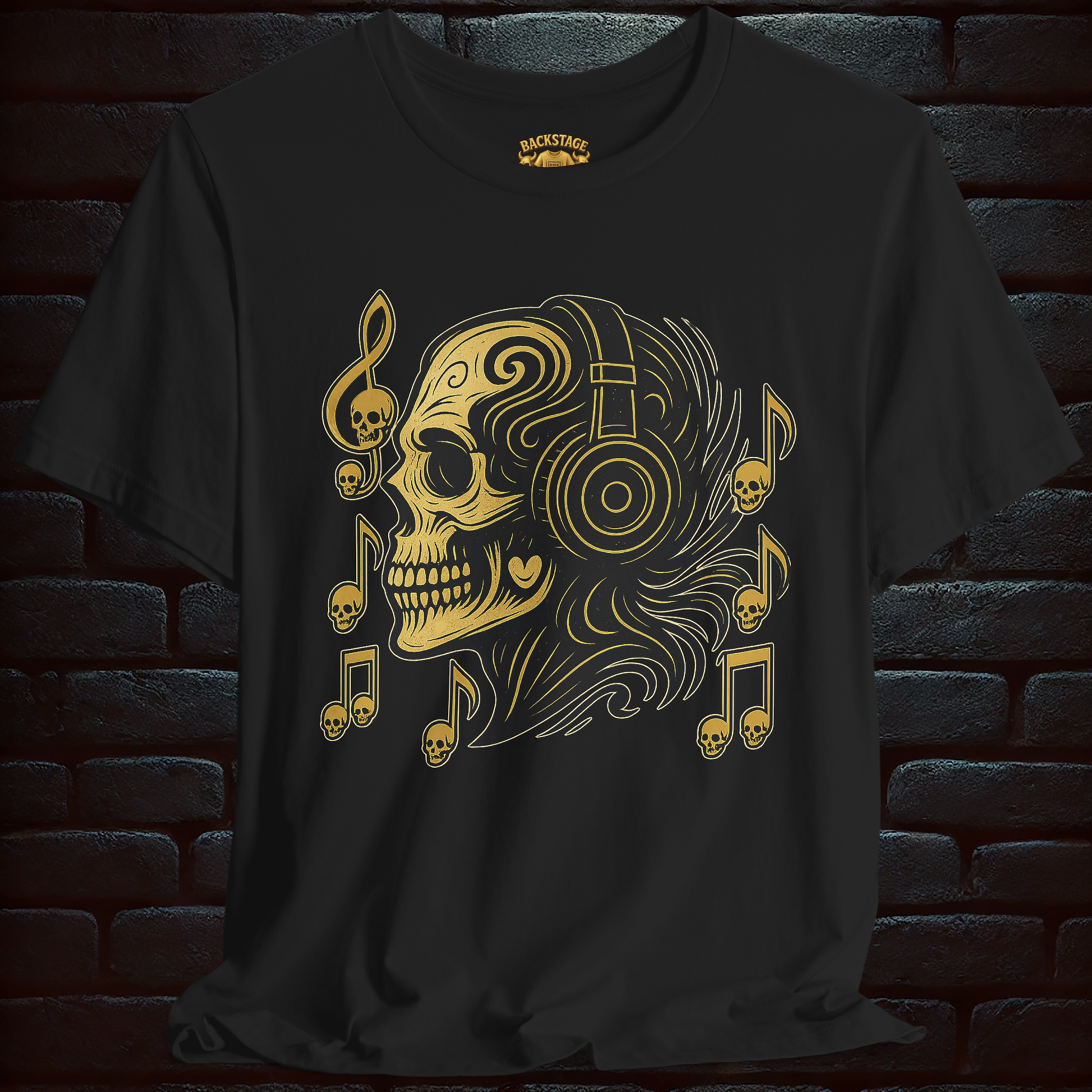 Featuring a gothic skull with headphones surrounded by golden music notes on the front, and a haunting back print with the words “In the romance of the night, the kiss of death”, this shirt is made for true rock ‘n’ roll souls.